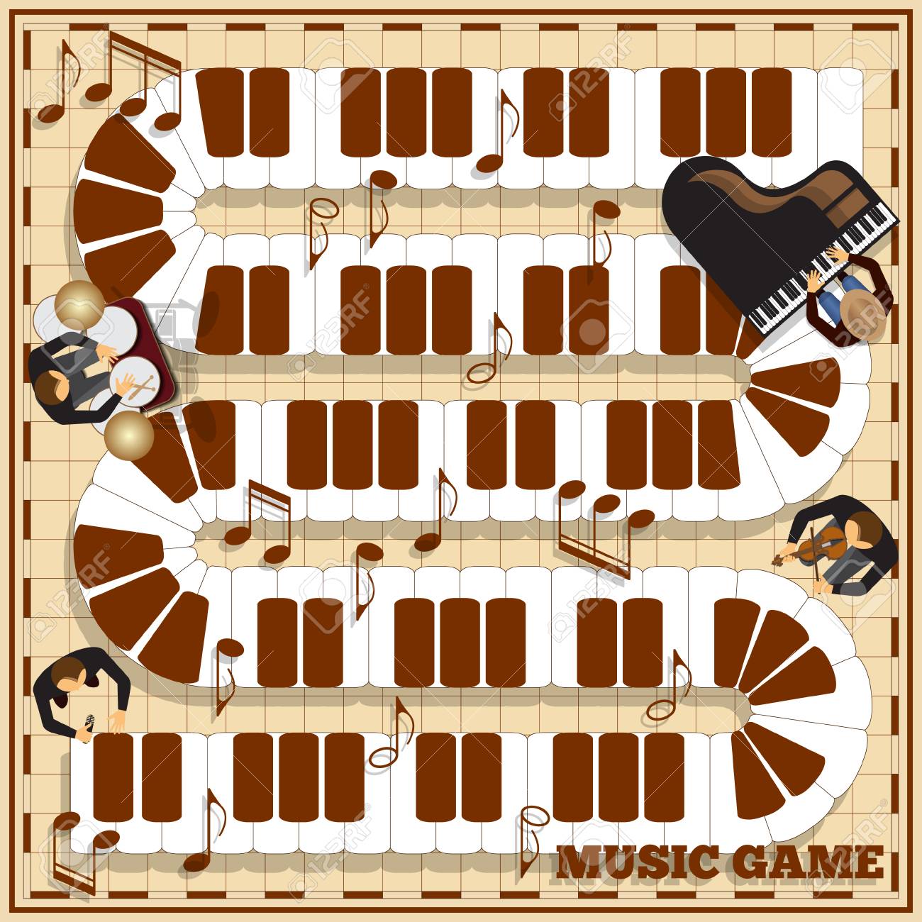 市松模様のフィールドにはピアノの鍵盤 ミュージシャンは楽器を演奏し